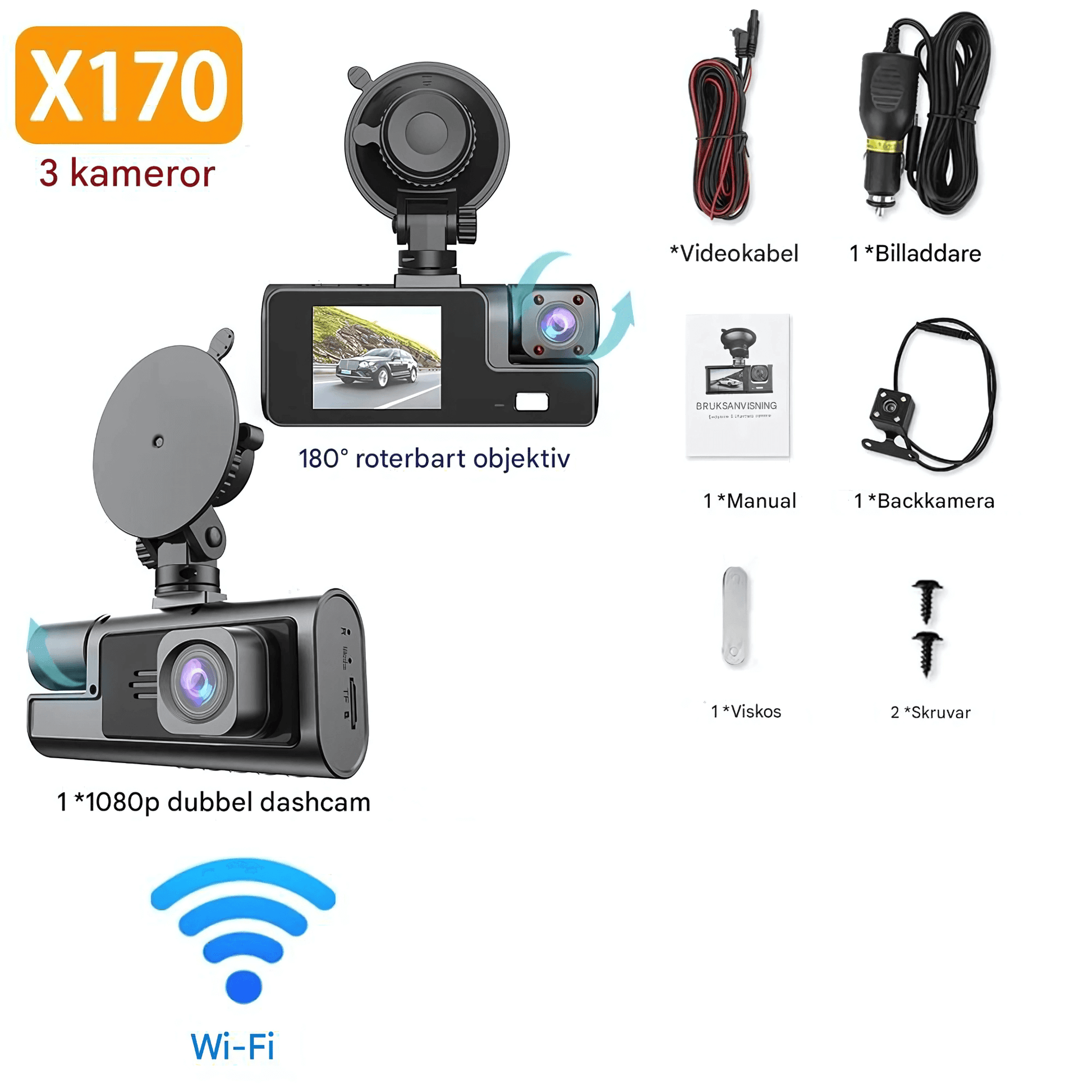 DriveSight – Dashkamera med 3 kameraer, 1080P-video, WiFi og nattsyn for overvåking foran, innvendig og bak