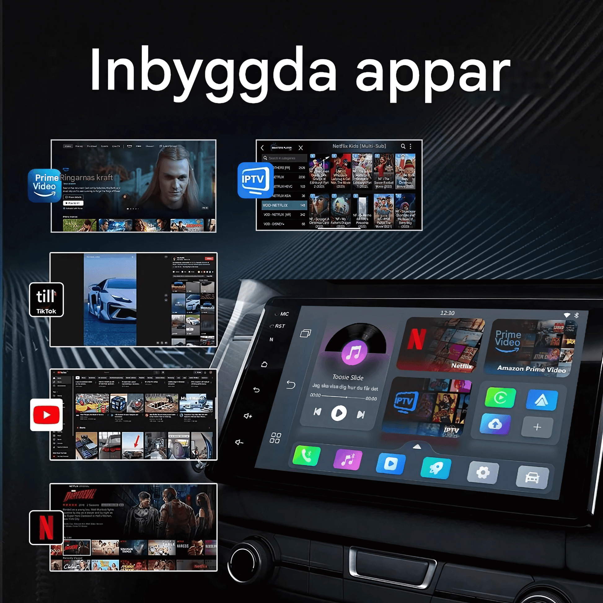 - 📺 Se videoer fra YouTube, Netflix, TikTok og mer – rett i bilen din