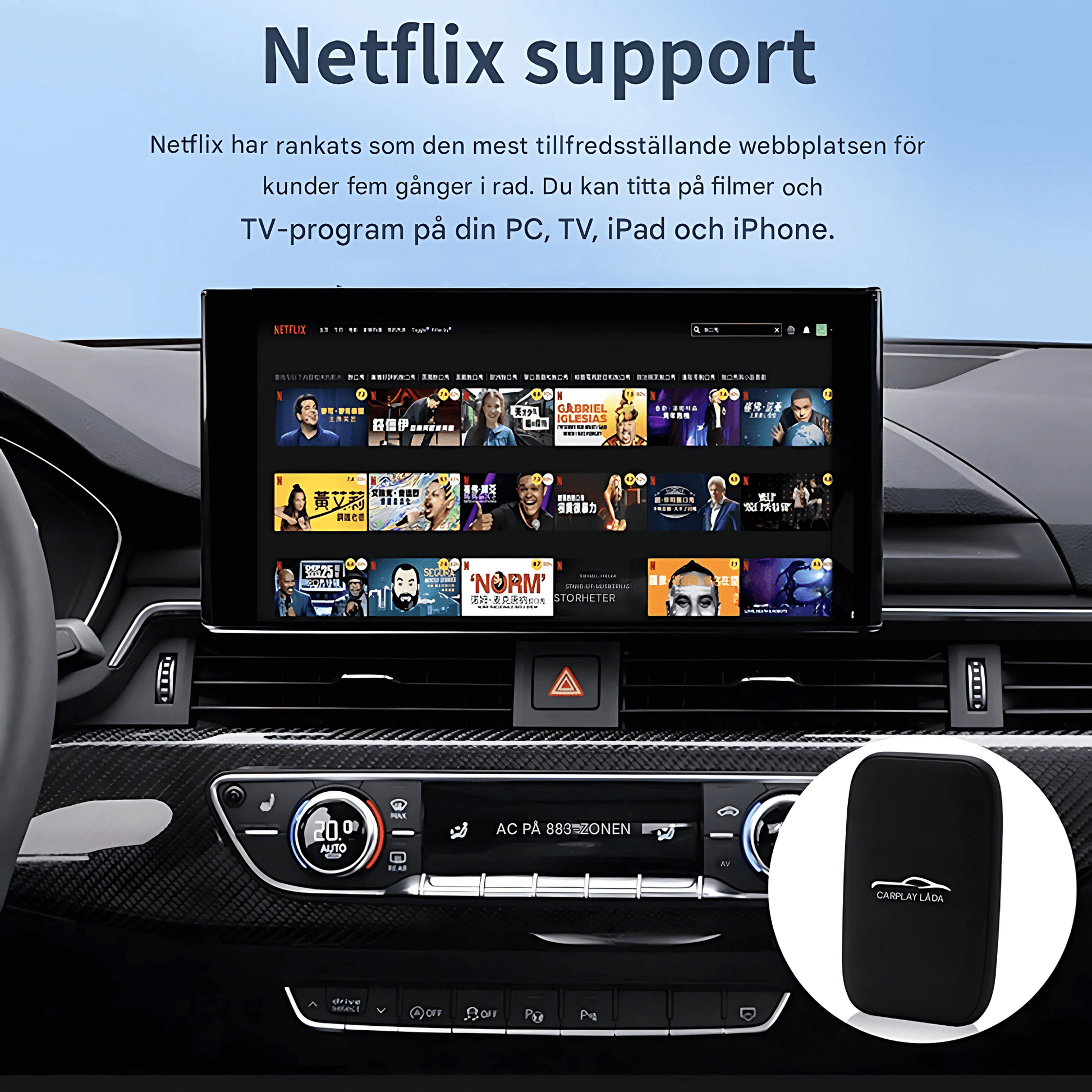 StreamRide SmartBox kobler telefonen din trådløst til bilens infotainmentsystem – men det stopper ikke der. Du kan få tilgang til apper som YouTube og Netflix direkte fra enheten uten å måtte speile telefonen. Perfekt for pauser eller underholdning av passasjerer.