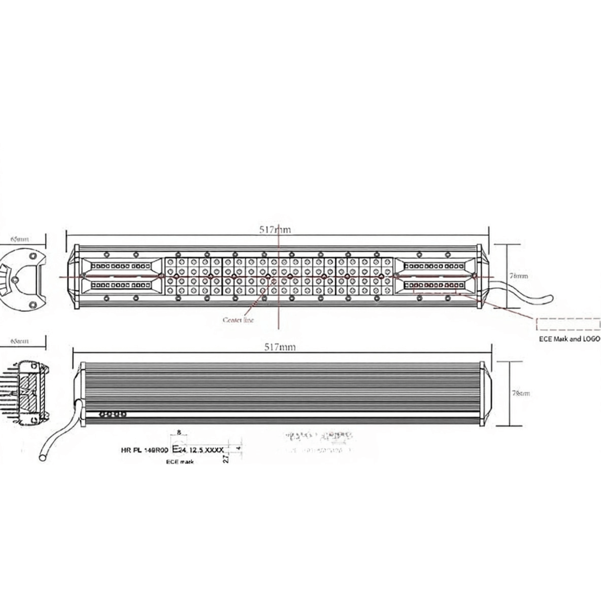 - 4ROW + 2ROW hybriddesign – Midtseksjonen benytter en tett 4-raders LED-konfigurasjon, mens sidene har 2-raders reflekterende seksjoner. Denne kombinasjonen kan gi både lang rekkevidde og bred lysdekning.