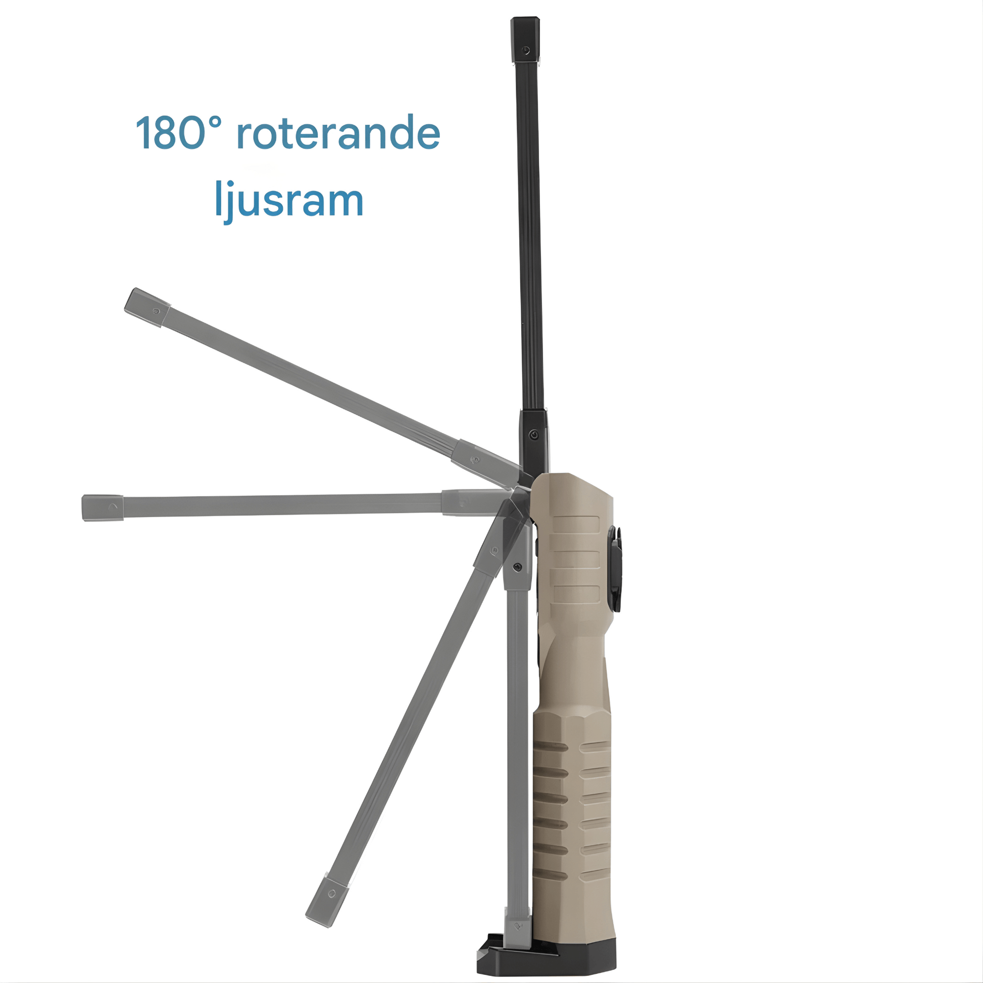 Lampan kan vikas upp till 180° och roteras för att rikta ljuset exakt dit du behöver det. Den flexibla designen gör det möjligt att använda lampan både stående, hängande eller som handhållen lampa, vilket kan underlätta vid olika arbets- och fritidssituationer.