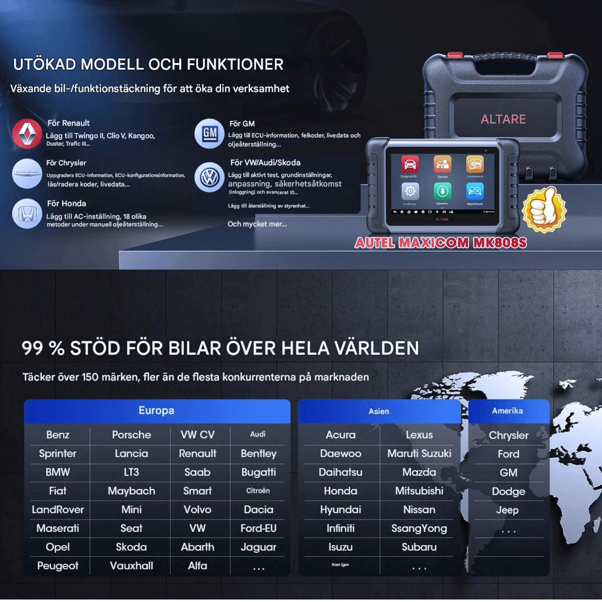 Stöd för över 150 bilmärken och tusentals modeller – inklusive många europeiska, asiatiska och amerikanska fordon från 1996 och framåt.