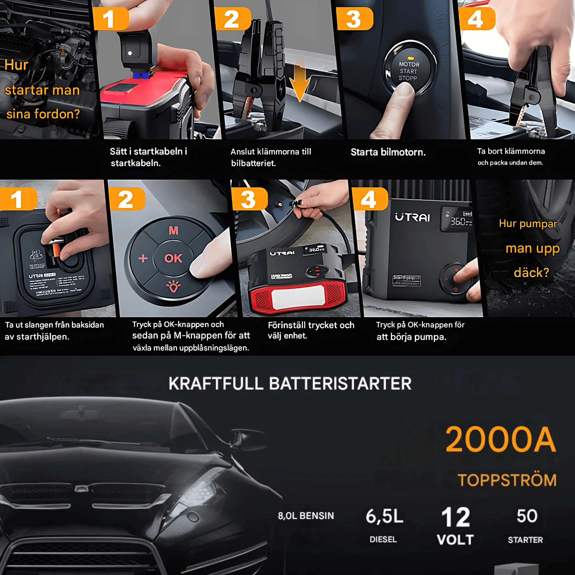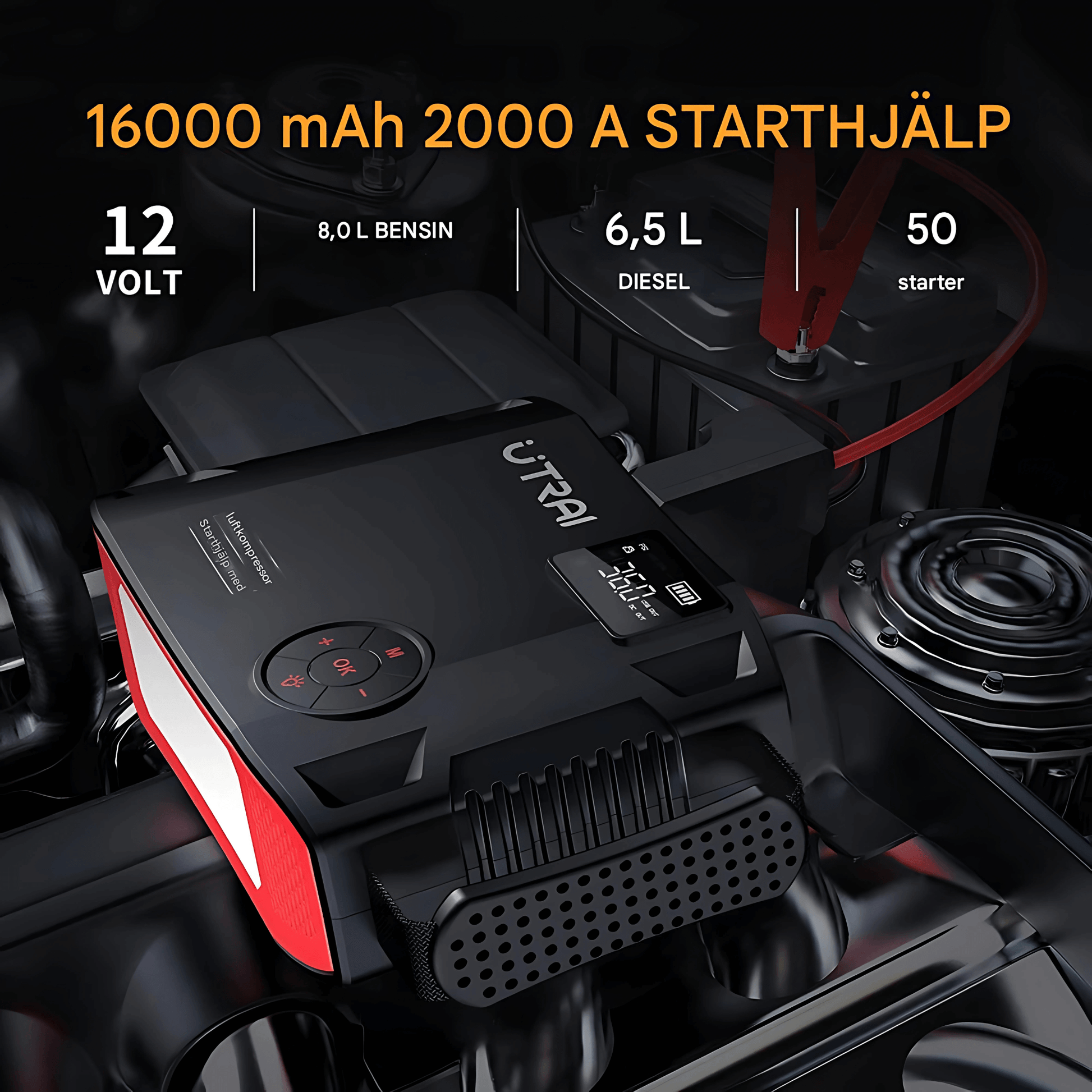 - 🚗 2000A toppström – kan bidra till att starta de flesta bensin- och dieselmotorer