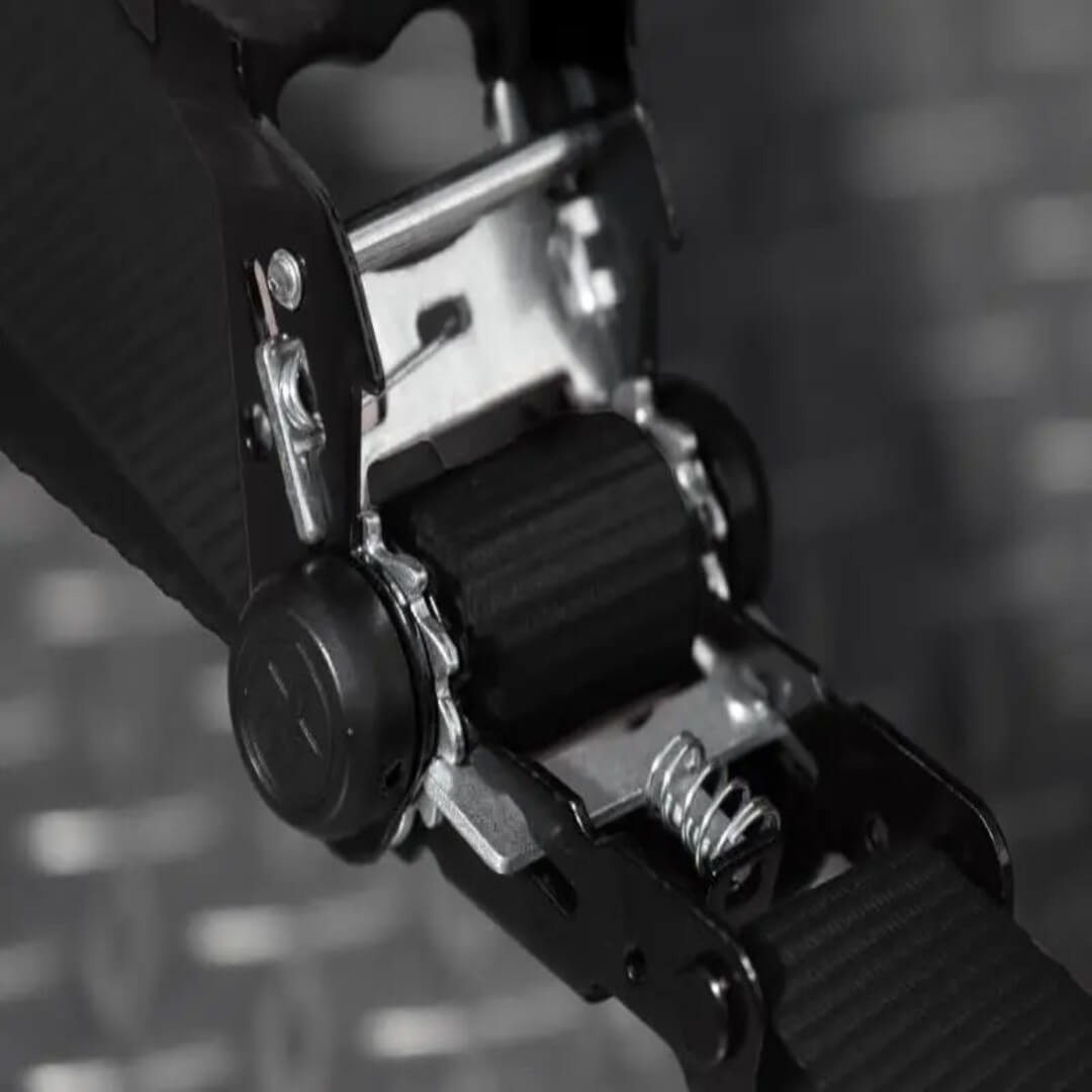 Banden är gjorda av poly-silke för en balans mellan styrka och flexibilitet, medan spännet är i anodiserat stål med vadderade handtag och belagda, helböjda S-krokar.